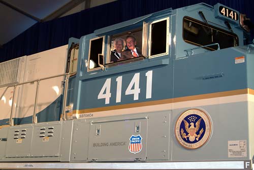Union Pacific is paying tribute to President George Herbert Walker Bush with a custom-painted locomotive. Incorporating colors and elements of the Air Force One used during Mr. Bush's presidency, the new Union Pacific locomotive bears the number 4141, in honor of the 41st president. The special locomotive, which replicates Air Force One's design as a striking symbol of national pride and strength, was revealed to the former president during a ceremony near the George Bush Presidential Library and Museum on the Texas A&M University campus in College Station, Texas.